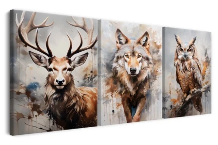 Każdy z trzech obrazów na płótnie przenosi nas w samo serce natury, ukazując z bliska pełnego godności jelenia z rozłożystym porożem, przenikliwego wilka o mądrym spojrzeniu oraz mądrej i czujnej sowy siedzącej na gałęzi.