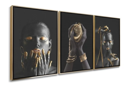 Ten tryptyk na płótnie prezentuje trzy portrety kobiety, utrzymane w ciemnej, eleganckiej stylistyce. Każdy z obrazów przedstawia fragment kobiecej sylwetki, z wyrazistymi złotymi akcentami. Obraz jest oprawiony w ramy, podkreślające nowoczesny i elegancki styl tryptyku.