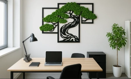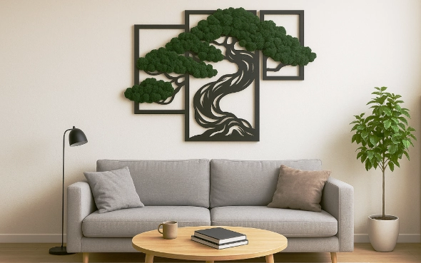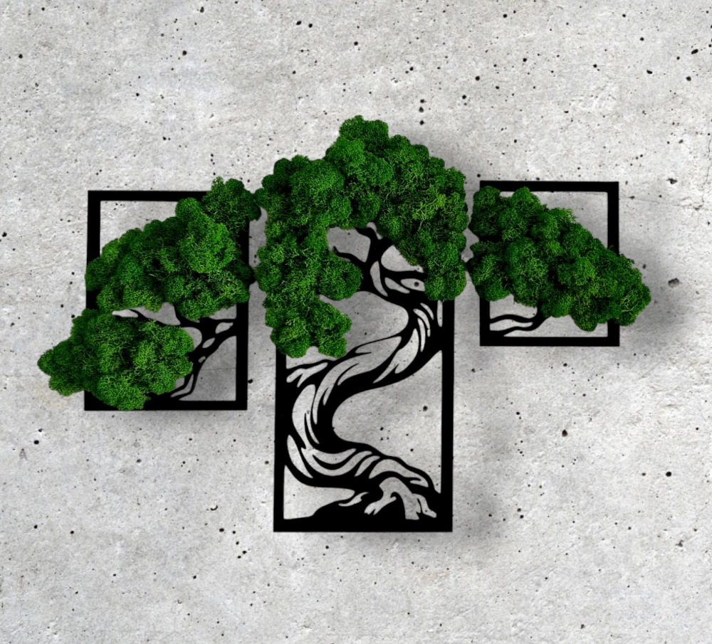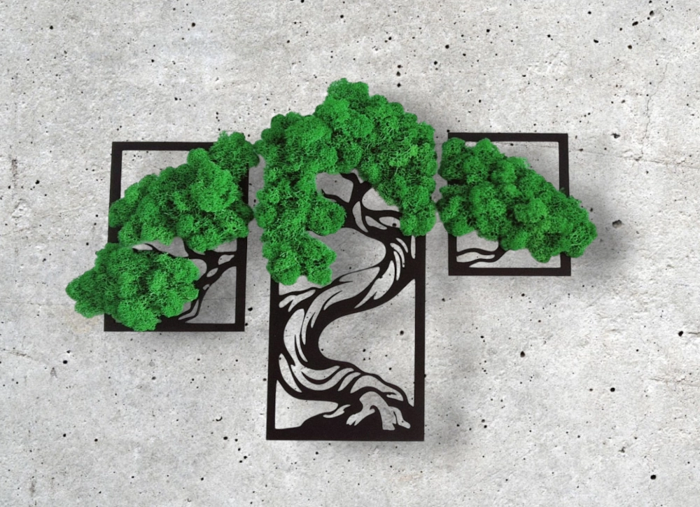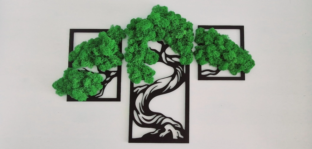Ten tryptyk to nowoczesna i oryginalna dekoracja ścienna, która wniesie do Twojego wnętrza odrobinę natury bez konieczności pielęgnacji. Składa się z trzech paneli, na każdym z nich umieszczono trójwymiarową aplikację przedstawiającą fragment drzewa bonsai.