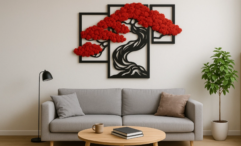 Ten tryptyk to nowoczesna i oryginalna dekoracja ścienna, która wniesie do Twojego wnętrza odrobinę natury bez konieczności pielęgnacji. Składa się z trzech paneli, na każdym z nich umieszczono trójwymiarową aplikację przedstawiającą fragment drzewa bonsai.