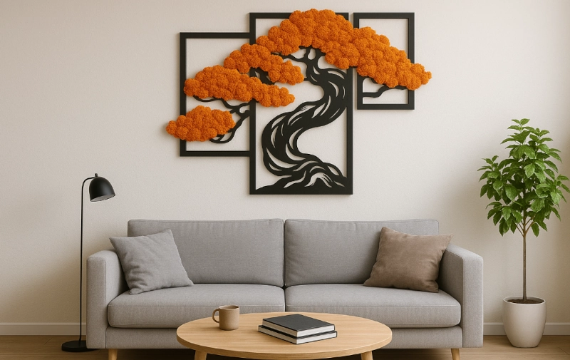 Ten tryptyk to nowoczesna i oryginalna dekoracja ścienna, która wniesie do Twojego wnętrza odrobinę natury bez konieczności pielęgnacji. Składa się z trzech paneli, na każdym z nich umieszczono trójwymiarową aplikację przedstawiającą fragment drzewa bonsai.