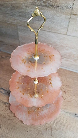 Elementem łączącym poziomy jest elegancka, złota kolumna z ozdobnym uchwytem na szczycie. Jej klasyczna forma i połysk doskonale kontrastują z miękkością i przejrzystością żywicy, tworząc spójną i harmonijną całość. Ta ręcznie wykonana patera to dowód na precyzję rękodzieła i dbałość o najdrobniejsze detale.