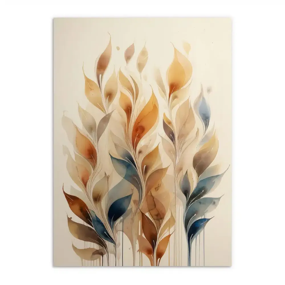 Delikatna, akwarelowa technika sprawia, że roślinne motywy zdają się płynąć na wietrze, wprowadzając do pomieszczenia powiew świeżości i artystycznej swobody.