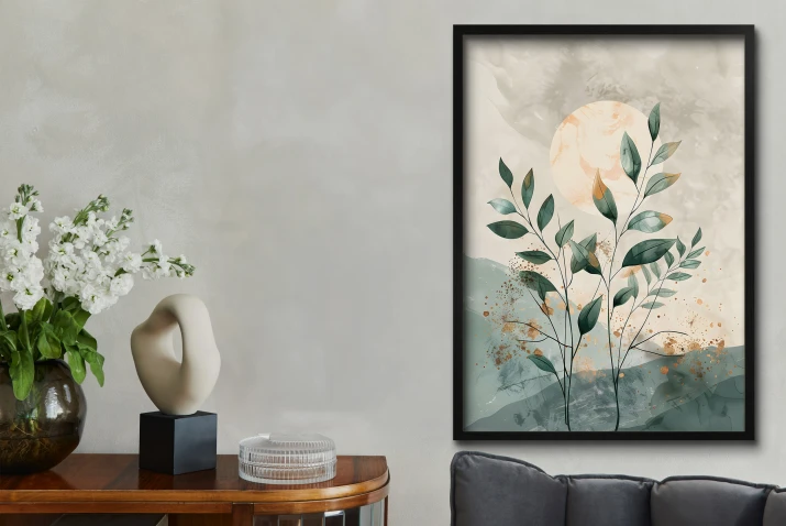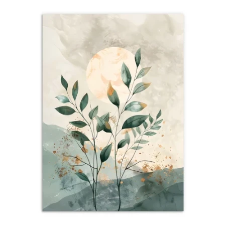 Jeśli szukasz sposobu na szybkie odświeżenie wnętrza, ten botaniczny plakat z liśćmi będzie strzałem w dziesiątkę. Subtelna kompozycja gałązek na tle rozmytego, świetlistego słońca wprowadza do pomieszczenia harmonię i delikatną elegancję, której nie powstydziłby się najlepszy projektant wnętrz.