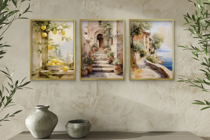 Masz ochotę na małą podróż, ale bez pakowania walizek i stania w kolejkach? Ten tryptyk to Twoja brama do słonecznej Italii! Wyobraź sobie te soczyste cytryny, które same proszą się o lemoniadę, te urokliwe, stare schody z doniczkami, gdzie czas się zatrzymał, albo ten zapierający dech w piersiach widok na morze z klimatycznej uliczki.