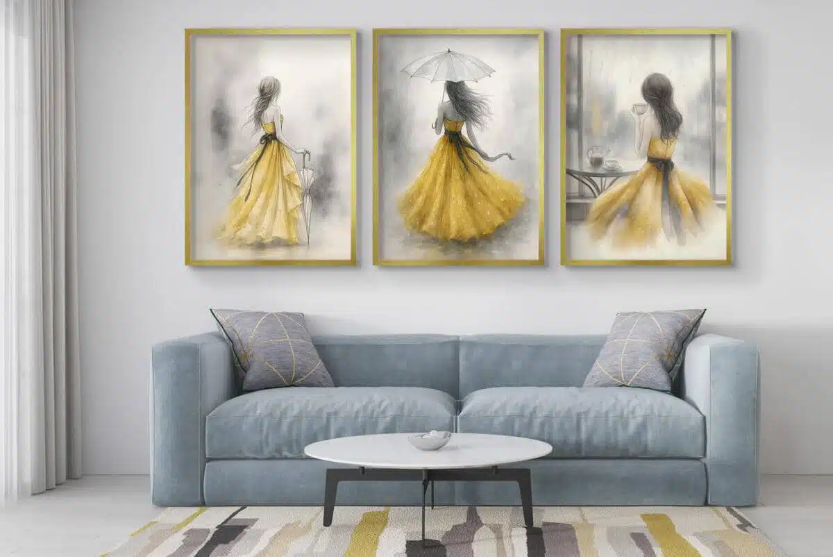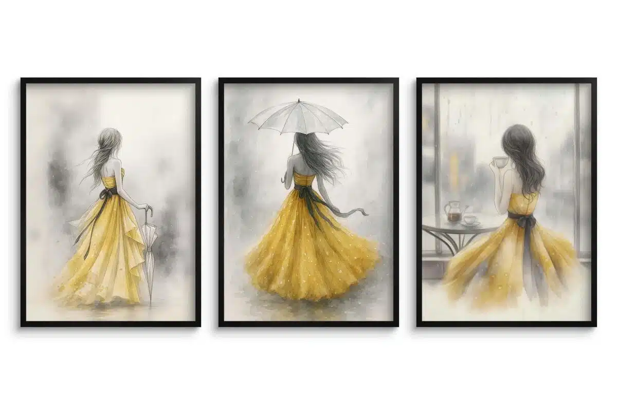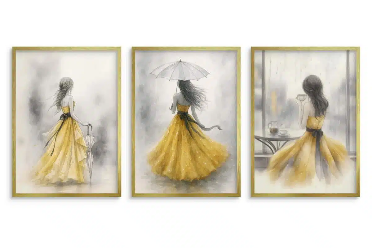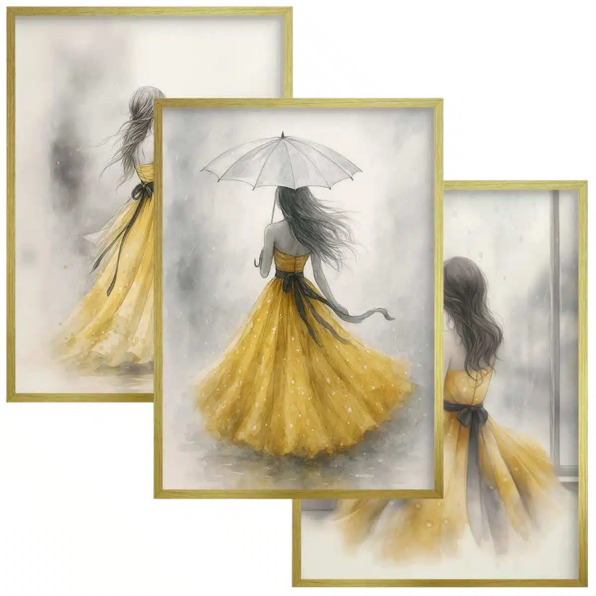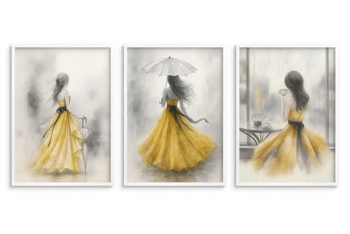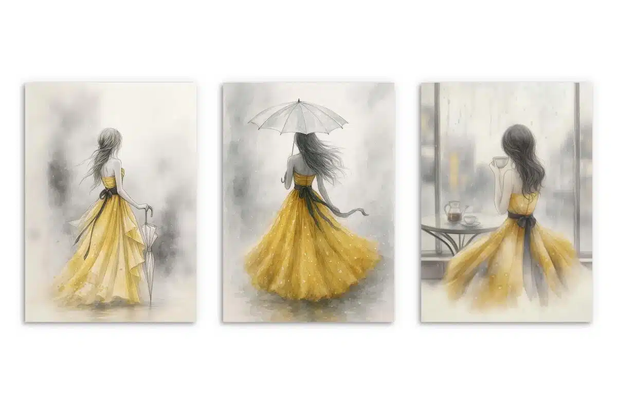 Główną bohaterką jest postać dziewczyny w zwiewnej sukience, której barwa mocno kontrastuje z otaczającą ją szarością i bielą. To odważny, ale jednocześnie subtelny akcent, który natychmiast przyciąga wzrok. Cała kompozycja utrzymana jest w delikatnej, przypominającej akwarele stylistyce, co nadaje plakatom lekkości, nastrojowości i artystycznego charakteru.