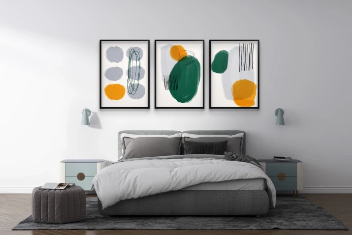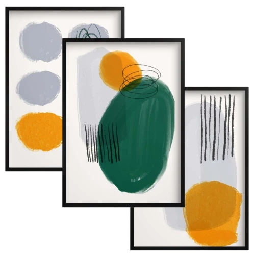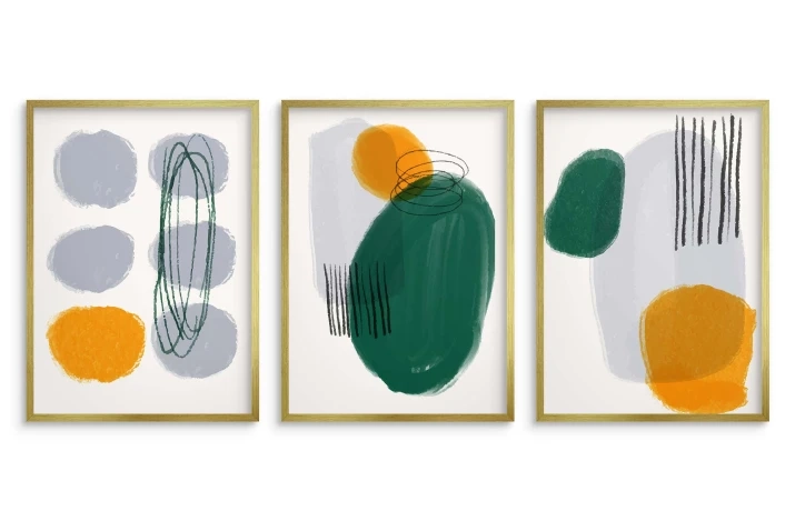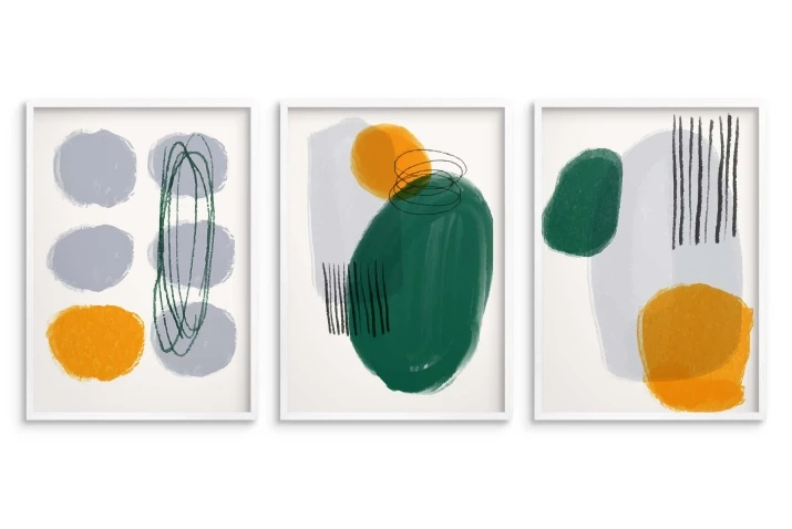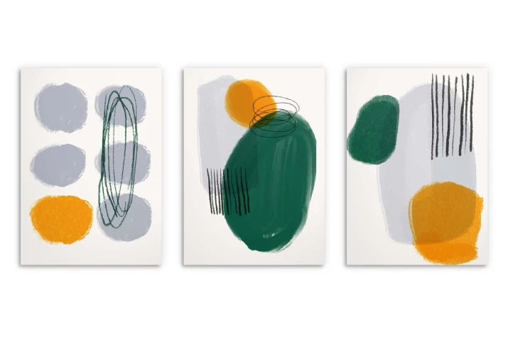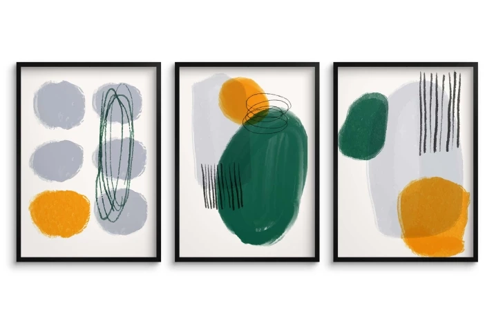 Abstrakcyjne formy i nietypowe połączenia barw wprowadzą do twojego domu energię i artystyczną swobodę. Zamiast szukać pojedynczych grafik, masz spójny tryptyk, który od razu możesz powiesić na ścianie.