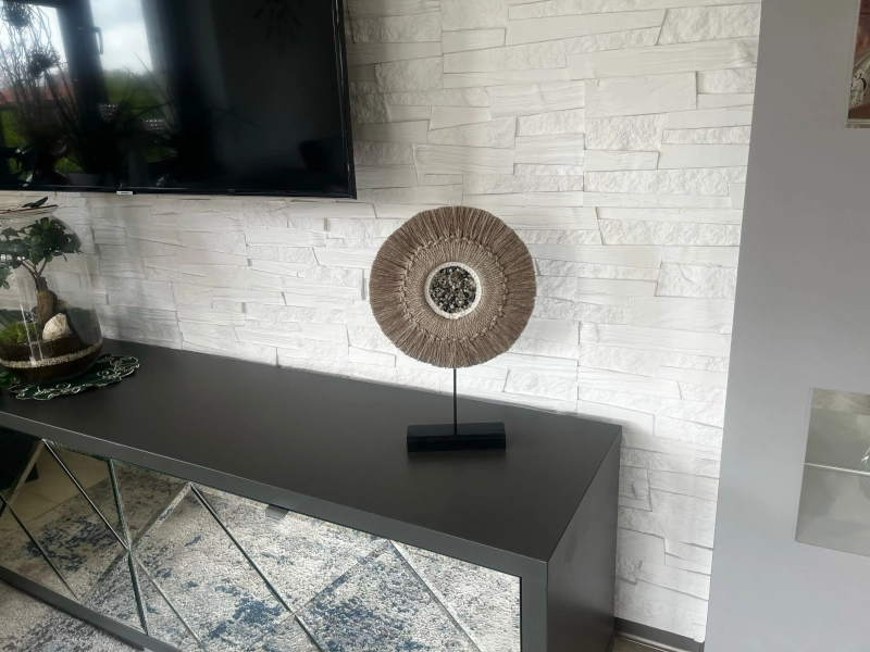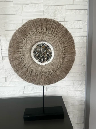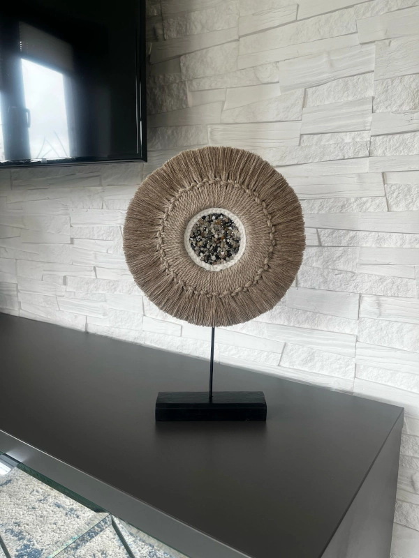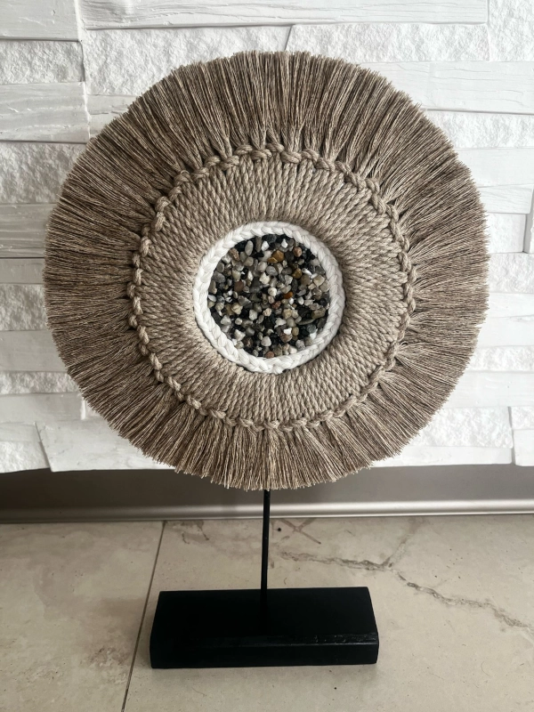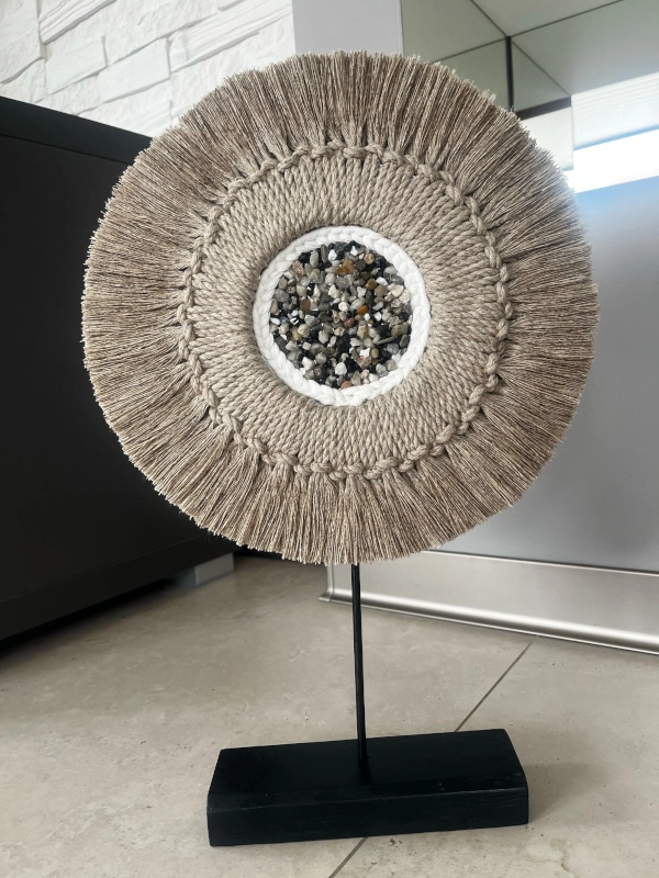 Centralną część dekoracji zdobi wypełnienie z naturalnych kamieni w różnorodnych odcieniach szarości i bieli, otoczone białym, plecionym sznurkiem konopno-bawełnianym. Kolejne warstwy tworzy grubo pleciony sznurek konopno-bawełniany w naturalnym, beżowym odcieniu, zakończony efektownymi, luźno opadającymi frędzlami.