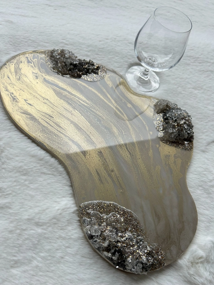 Odkryj ręcznie robioną tacę z żywicy epoksydowej. Luksusowy design, złote i beżowe akcenty. Idealna jakodekoracja salonu.