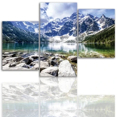 Zestaw trzech obrazów na płótnie przenosi nas wprost nad brzeg tego krystalicznie czystego jeziora, otoczonego strzelistymi, ośnieżonymi szczytami gór.