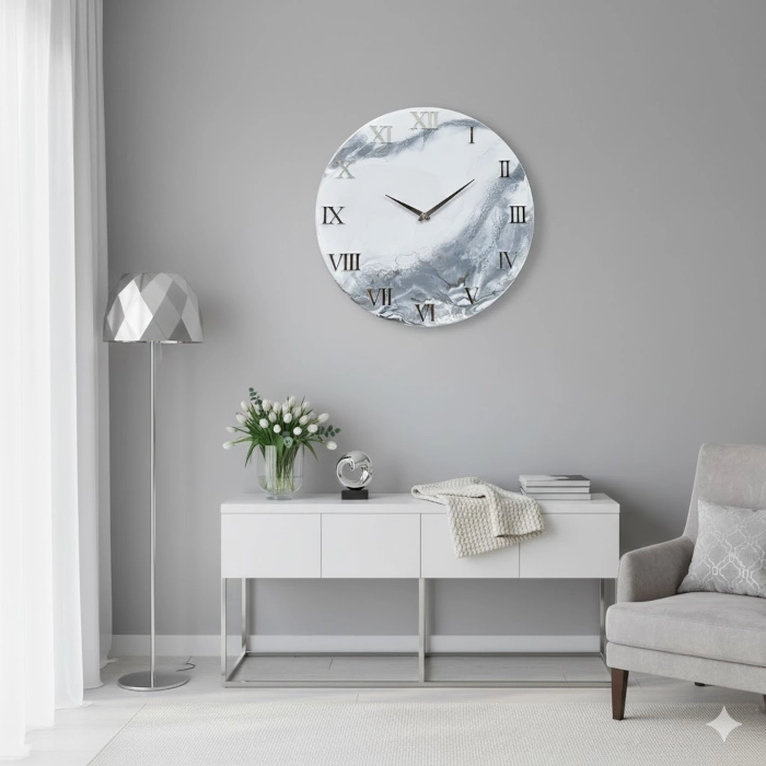 - Subtelny Efekt Marmuru: Tarcza zegara, wykonana z wysokiej jakości żywicy epoksydowej, hipnotyzuje odcieniami chłodnej bieli i delikatnej, srebrzystej szarości. Płynne, artystyczne smugi imitują elegancki, szary marmur, tworząc efekt "geody" lub fali.