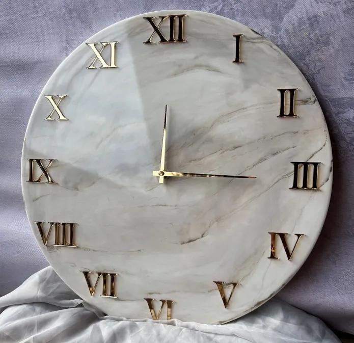 Jeśli szukasz wyjątkowej dekoracji do nowoczesnego wnętrza, która łączy funkcjonalność z dziełem sztuki, ten zegar z żywicy w stylu marmuru jest stworzony dla Ciebie. To także doskonały, ekskluzywny pomysł na prezent na nowe mieszkanie lub ślub.