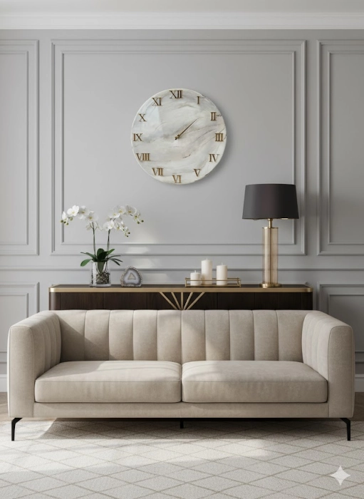Ten ręcznie robiony zegar ścienny o średnicy 50 cm to esencja luksusu i nowoczesnego rzemiosła, stworzona z pasją w Polsce. Idealnie wpisuje się w trendy wnętrzarskie, takie jak Glamour, Modern Classic oraz Art Deco. Jest to element dekoracyjny, który natychmiast staje się centralnym punktem każdego pomieszczenia.