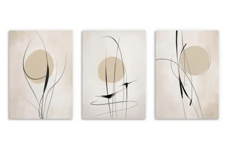 Inspiracja naturą i filozofią wschodu zamknięta w nowoczesnej formie. Nasz zestaw "Zen Garden" to plakaty z motywem koła i linii, które symbolizują równowagę. Dynamiczne pociągnięcia pędzla przypominające źdźbła traw lub trzcin na tle piaskowego słońca tworzą unikalny klimat. Ten tryptyk świetnie sprawdzi się jako dekoracja do gabinetu lub kącika do jogi i medytacji. Dzięki stonowanej palecie barw – beżom, czerni i przygaszonemu złotu – grafiki te nadają wnętrzu luksusowy, a zarazem kojący charakter.