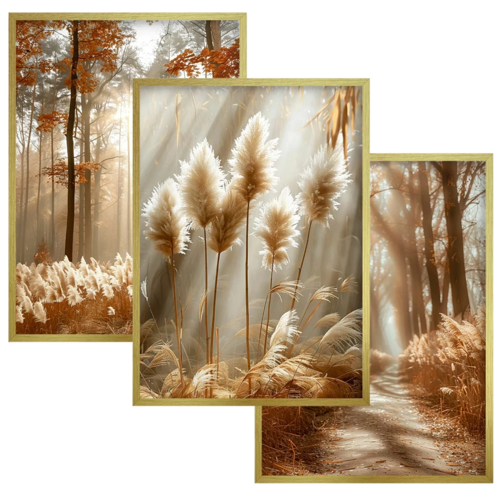 Zestaw 3 Plakatów Boho: Złota Jesień w Lesie – Tryptyk z Trawą Pampasową i Promieniami Słońca